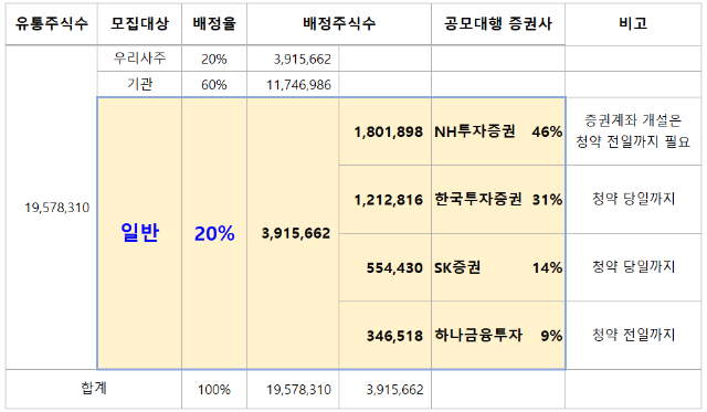 총 유통주식수 중 20%가 우리 일반에 배정되며 NH투자증권, 한국투자증권, SK증권, 하나금융투자가 이번 공모를 대행합니다. 비고란에 기재한 것처럼 이번 공모에 참여하려면 청약 전날까지는 해당 증권사에 계좌를 개설하고 HTS(홈트레이딩시스템), MTS(모바일트레이딩시스템)를 설치하셔야합니다.