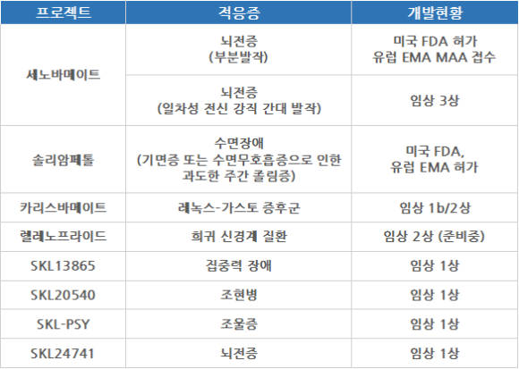 SK바이오팜은 신약 후보물질의 발굴부터 글로벌 임상 시험, FDA 신약 판매 허가 신청까지, 국내 최초로 전 과정을 독자적으로 진행하며 차별화된 신약 개발역량을 가지고 있다고 평가 받고 있습니다. 현재 SK바이오팜은 중추신경계 및 항암 분야를 중심으로 혁신 신약 개발에 집중하며, 총 8개의 파이프라인을 보유 중에 있습니다.