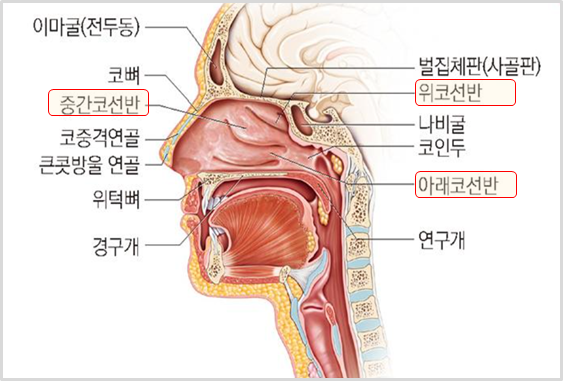 [네이즐 캐비티] 콧구멍에서 목젖 윗부분에 이르는 코안의 빈 곳. 냄새를 맡는 기능과 함께 공기 속의 이물질을 제거하며 들이마신 공기를 따뜻하게 여과시킵니다.