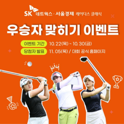 간단히 참여하실 수 있는 대회 이벤트도 진행중에 있으니 소소한 행운도 누려보세요. 지금 우승자 맞히기 이벤트가 진행중에 있습니다. 참여방식은 간단합니다. 따라해보시죠. SK네트웍스·서울경제 레이디스 클래식 '우승자 맞히기'