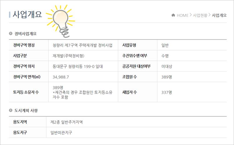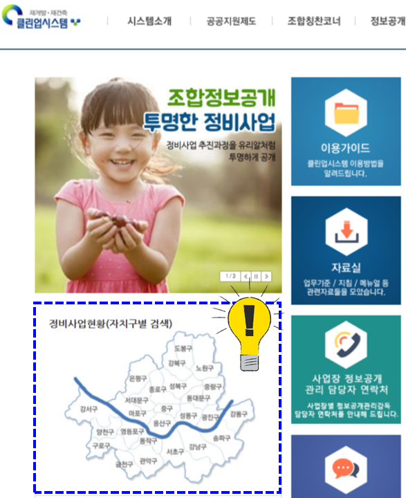 어때요? 아주 간단히 확인할 수 있었죠? 물론 클린업시스템에는 이 외에도 서울시의 재개발·재건축 정비사업에 대한 다양한 정보들을 방대하게 안내해주고 있으니 잘 활용하시면 분명 '득'이 될 거라는 점 잊지 말고 수시로 '들락날락' 해보시길 바랍니다. 물론 이 시스템에 업데이트가 덜 된 부분도 있을 겁니다. 직접적이고 세부적인 내용을 확인하고자 할 때에는 조합을 통하는 등 현장에서 직접 확인하는 것이 무엇보다도 중요할 겁니다.