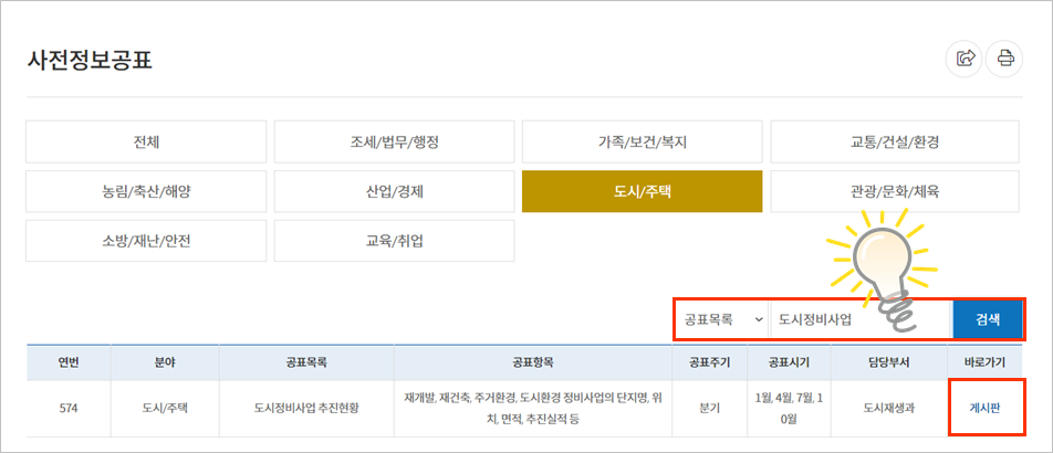 ② 사전정보공표, '도시/주택' 선택, 도시정비사업 검색