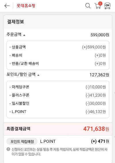 롯데홈쇼핑의 구매마케팅 구폰과 네이버 경유를 통해 받을 수 있는 플러스쿠폰, 일시불 할인, 여기에 L포인트까지 적용해서 구입한 가격은 바로 약 47만원입니다. 여기에 신용카드 청구할인이 5% 추가 적용되어서 실제 구입가격은 약 44만원이었습니다.