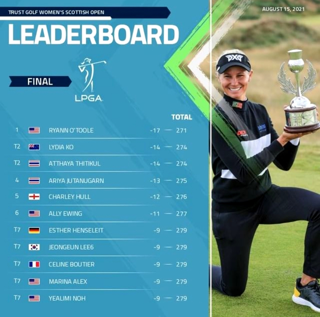 트러스트 골프 위민스 스코티시 오픈의 최종순위, 우승자는 투어 데뷔 10년차 228번째 대회 출전 끝에 첫 우승의 감격을 누린 라이언 오툴 Ryann O'Toole(34세, 미국) 입니다. 이 대회 전까지 지난 10년간 톱10에 든 대회가 겨우 11번에 불과했지만 이번엔 달랐습니다. 최종 라운드 태국의 아타야 티티쿨, 뉴질랜드의 리디아 고 선수의 맹추격을 따돌리고 8타를 줄이며 17 언더파로 첫 우승 획득. 라이언 오툴과 챔피언조로 FR를 시작한 아리야 주타누간(태국), 찰리 헐(잉글랜드) 선수는 각각 4타씩을 줄이며 공동4위로 대회 마감했습니다.