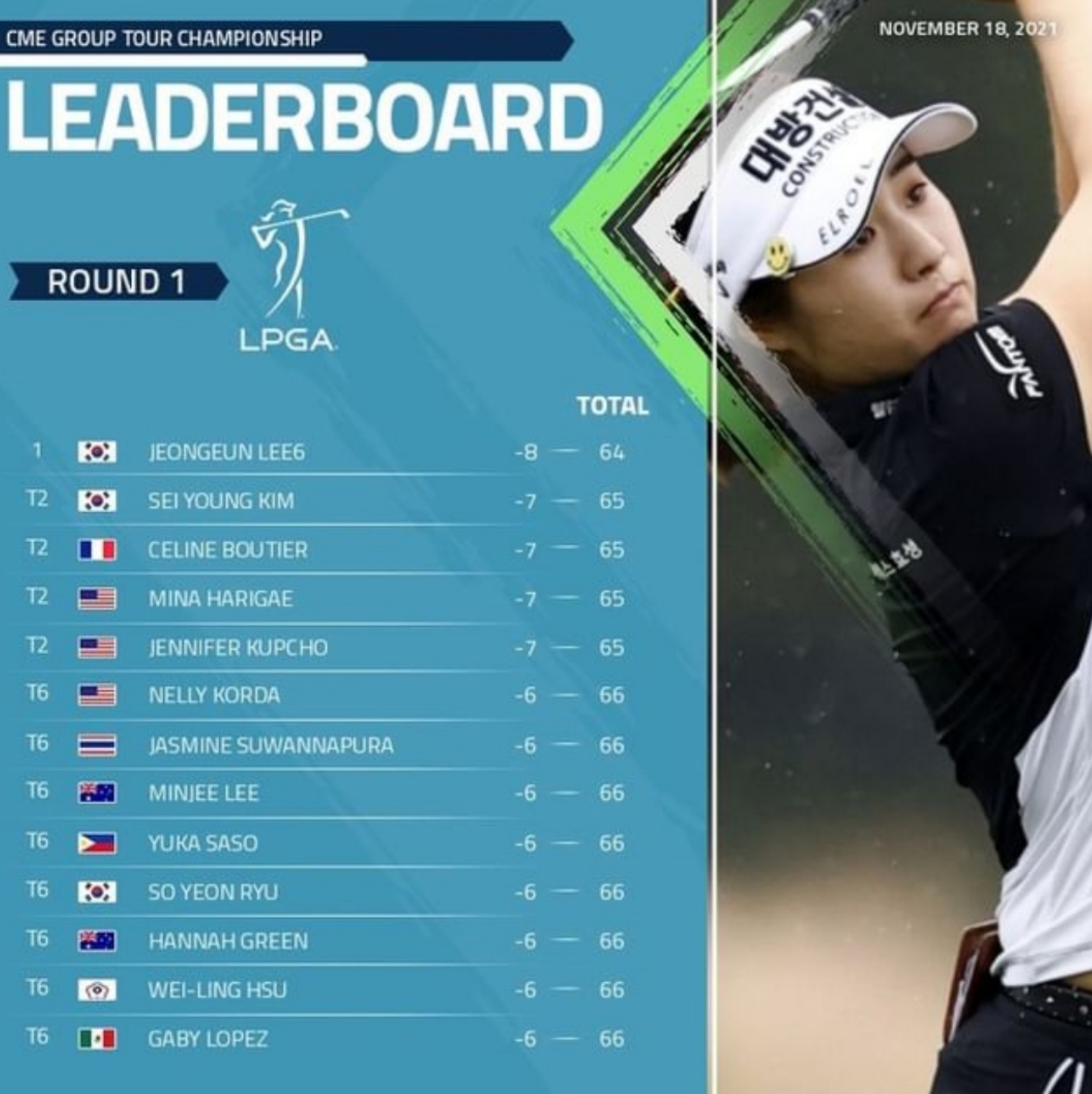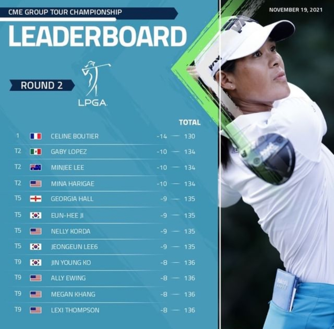CME 그룹 투어 챔피언십 1라운드 선두였던 이정은6가 2라운드 1언더파로 주춤한 가운데, 프랑스 Celine Boutier이 2라운드 단독 선두로 나섰다. LPGA 통산 1승을 기록하고 있는 셀린 부티에가 1, 2라운드 모두 7타씩을 줄이며 14언더파 단독 선두이다.