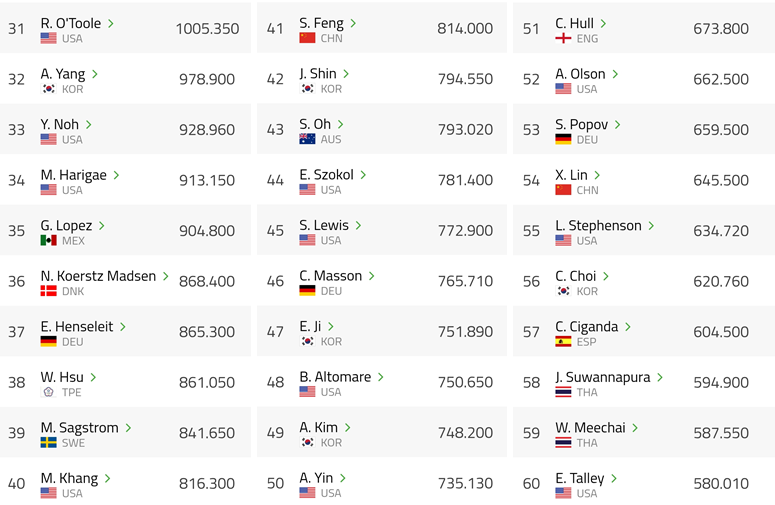 현재 CME 포인트 51위에서 60위까지의 선수들은 펠리컨 위민스 챔피언십 결과에 따라 순위가 뒤바뀔 수 있다. 참고로 현재 60위(엠마 탈리/미국, 580점)와 70위(마리나 알렉스/미국, 489.8점)의 포인트 차이는 약 90점이다.