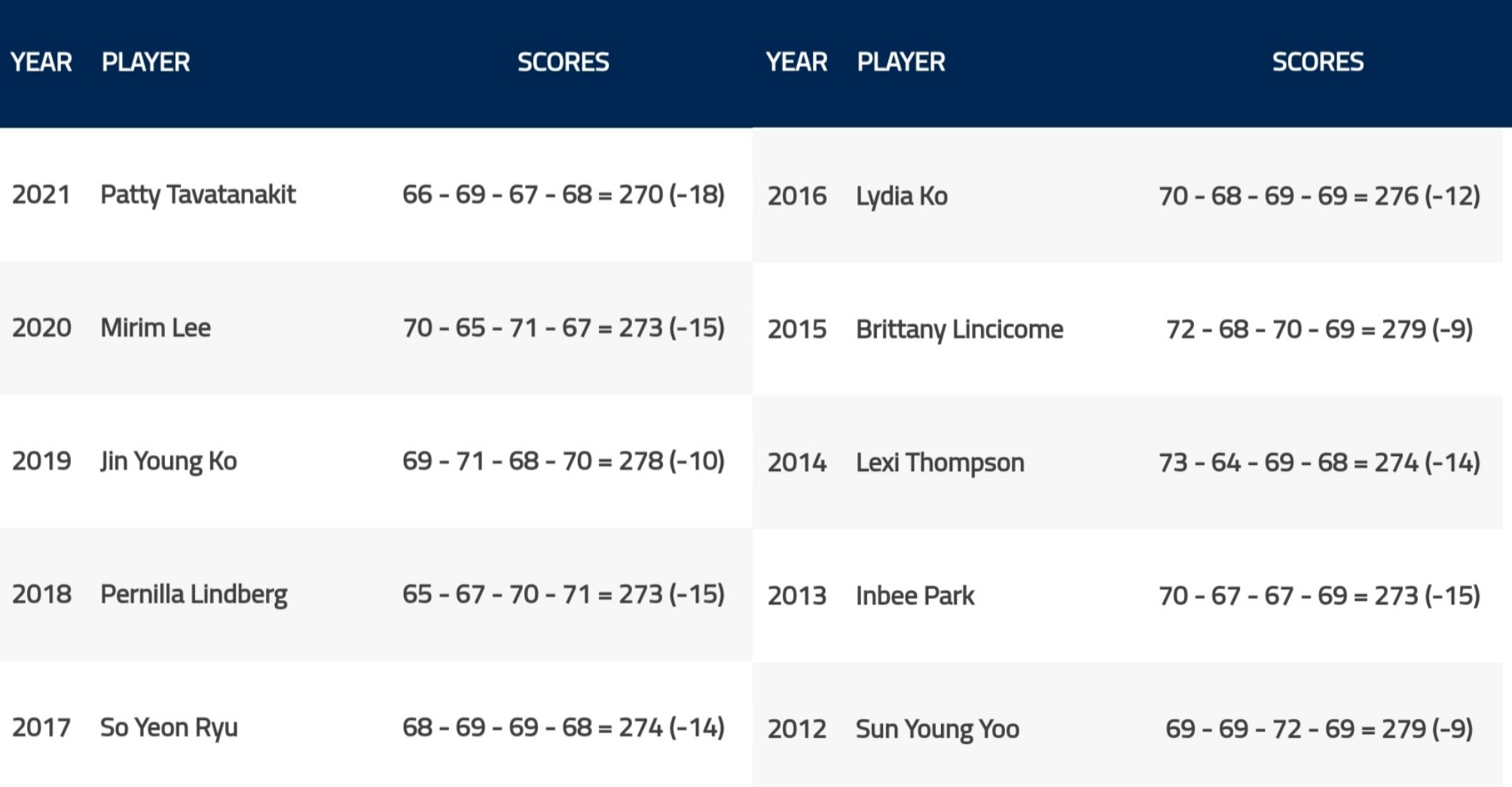 5. 디펜딩 챔피언: 2021년 우승자 Patty Tavatanakit(22세·태국). 2020년 LPGA 투어에 데뷔한 패티 타바타나킷은 이 대회 우승(66-69-67-68=270타)을 통해 2020-2021 통합 시즌 신인왕(Rolex Rookie of the Year)의 영광을 차지했다.