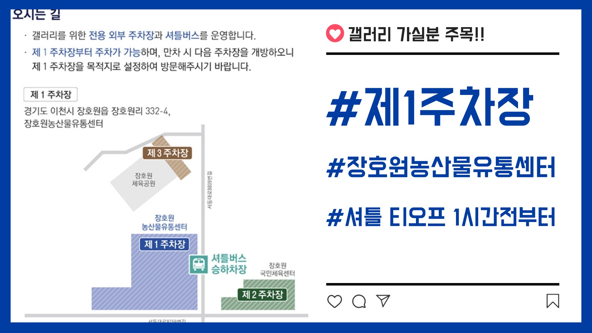 ■갤러리 주차 장소: 갤러리를 위한 전용 외부 주차장과 셔틀버스가 운영된다. 제1 주차장부터 주차 가능하며 만차시 다음 주차장을 개방할 계획이다. 우선 제1 주차장을 목적지로 설정해서 방문하면 된다.