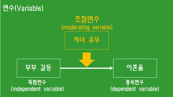 예를 들어본다. 이건 "부부 갈등이 이혼율을 높인다"라는 가설을 떠올려 보면 쉽다. 이때 <부부 갈등>이 독립변수, <이혼율>이 종속변수이다. 부부의 <자녀 유무>도 변수가 될 수 있지 않겠는가? 굳이 부연 설명하지 않아도 알 수 있을 것이다. 부부 갈등이 이혼율에 영향을 줄 수 있는데, 이때 <자녀 유무>라는 변수는 그 영향의 정도를 더 크게 혹은 더 작게 만들 수 있다. 이때 <자녀 유무>를 조절 변수라고 부른다.