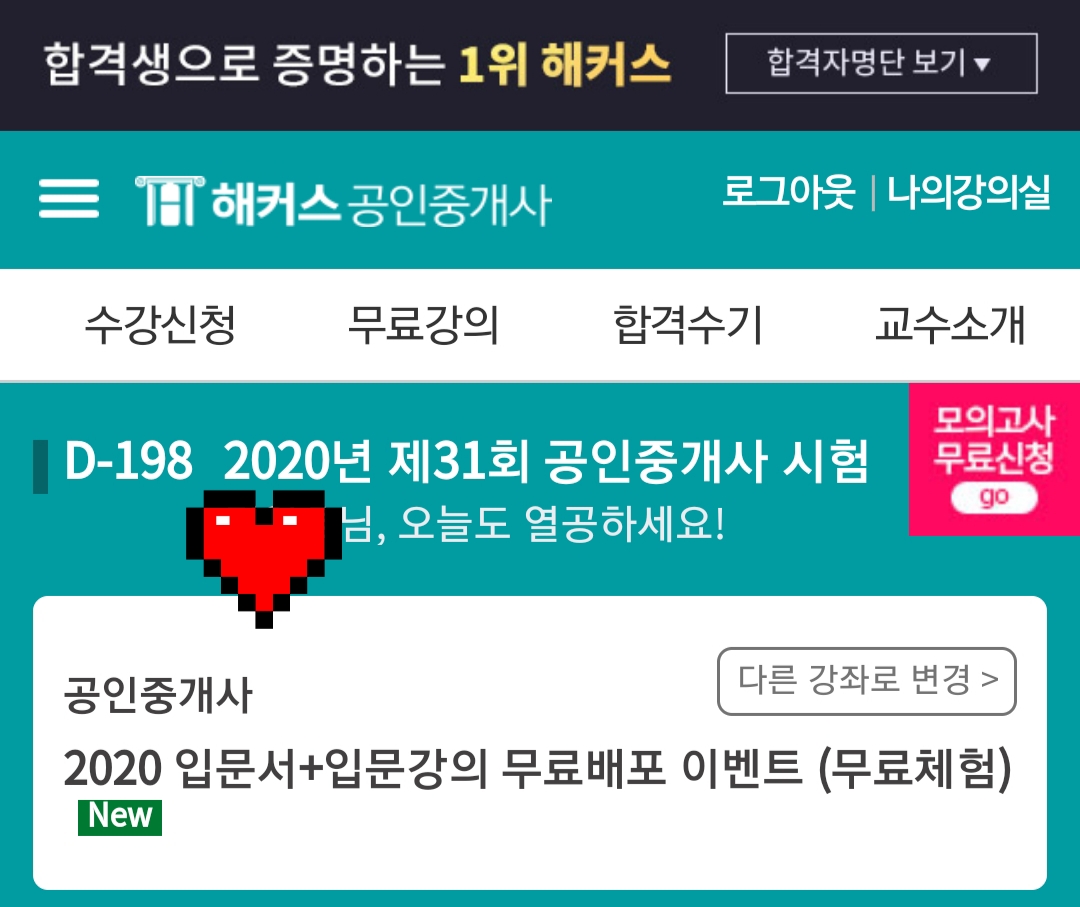 검색포탈에서 '해커스 공인중개사'를 검색하시면 이 광고를 만나보시게 될 겁니다. 사실 이건 절친한 제 회사 동료가 소개해줘서 알게 된 내용입니다. 공인중개서 기초입문서를 무료로 배포한다기에 관심이 생기더군요. 입문서를 선착순 200명에게 무료배포한다고 적혀있지만 배포가 한시적으로 끝나는 것은 아닙니다. 관심있는 분들은 이 포스팅을 참고하셔서 신청해보세요!